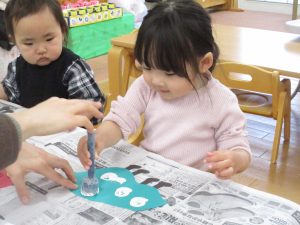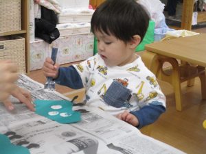 保育者がパーツにのりを付けて手渡しすると、ベタベタの感触を不思議そうに見つめる子、指を何度も触って感触を確かめる子、ちょっと嫌だな・・・という表情を見せる子✨