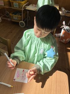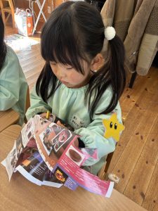 2組さんのシールやさんは、まず折り紙や広告のシールにしたいものをちょきちょき…✂️