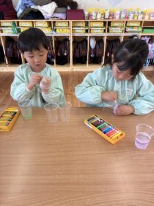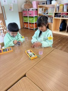 透明カップにクレヨンで色をつけられるのにもびっくりしていました!