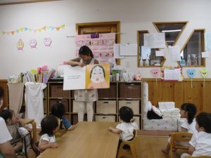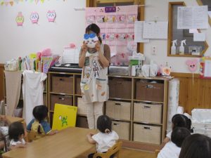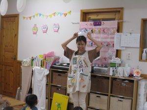 今月の出し物は大型絵本で「おめんです」のお話でした!!