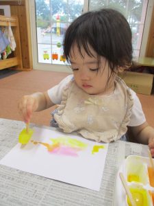 保育者が見本を見せながら手に絵の具が付かないことを知らせると、目をまんまるにして驚いてくれました♡