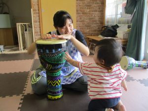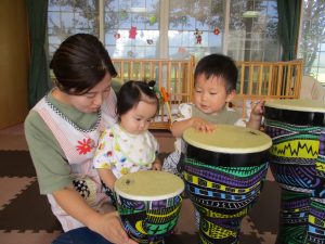 そんな子ども達と一緒に、初めて太鼓遊びに挑戦をしました。