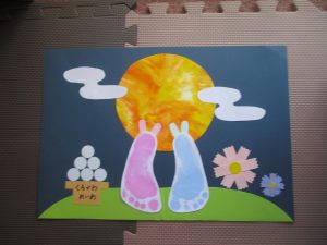 子どもたちの足型と、絵の具を使って作った月を使い、お月見製作を行いました。