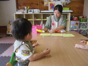 保育者が「みんなの好きな色はどれかな?」と聞くと、色を選択して教えてくれる子がいました💛