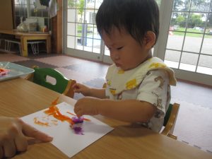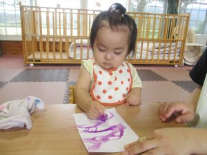 画用紙からはみ出すほど、大きく手を動かし色が付くことを面白がっていました。