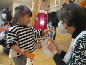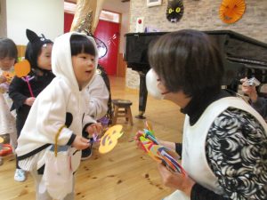 「トリックオアトリート!」とみんなで言ってみると、折り紙のキャンディーをもらうことができました🍭
