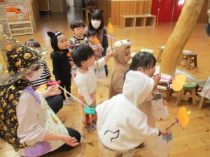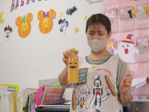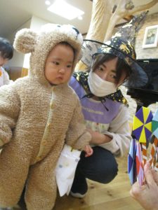 「トリックオアトリート!」とみんなで言ってみると、折り紙のキャンディーをもらうことができました🍭