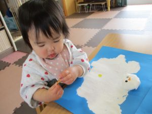 先週みんなが絵の具の感触を楽しんだ画用紙を使って、「とけちゃった雪だるま」の製作を行いました。