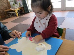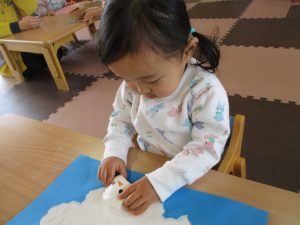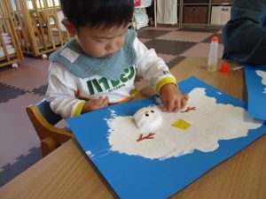 先週みんなが絵の具の感触を楽しんだ画用紙を使って、「とけちゃった雪だるま」の製作を行いました。
