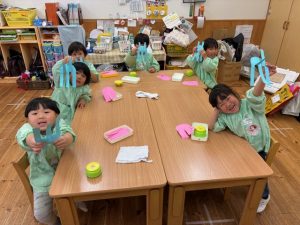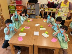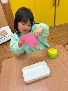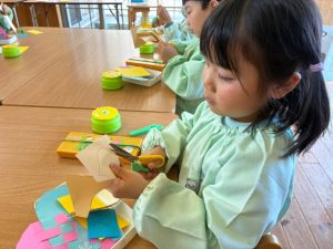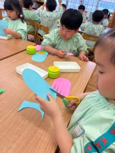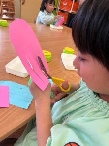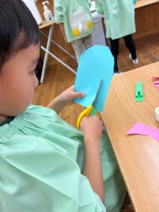 初めにはさみで曲線や直線を切っていきました✂️線がガタガタしないようゆっくりゆっくり切り進め、切り終えると綺麗に切れたことを保育者や友達と共有していました✨