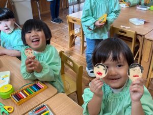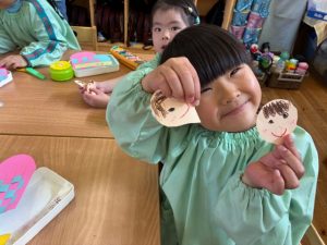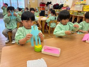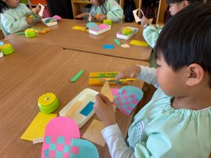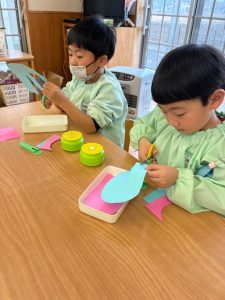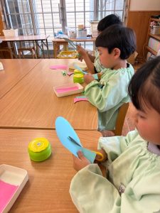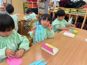 お内裏様やお雛様の顔づくりでは、はさみを細かく動かして小さな形も一所懸命切っていました!「小さいけれど頑張って切れた!」「簡単だった✨」とはさみも自由自在に切れるようになった喜びを味わっていました😌
