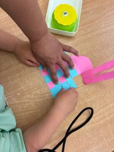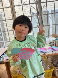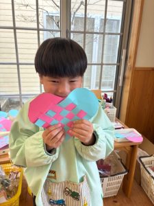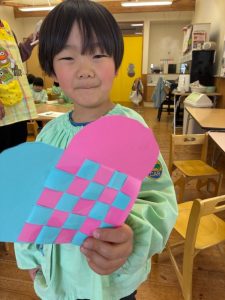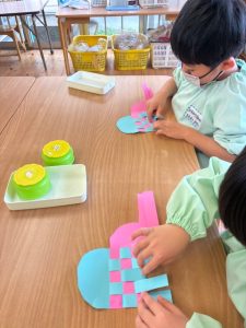 ひな祭り製作では、ピンクと水色の色画用紙を格子状に編んでいきハートの形を作りました❤️