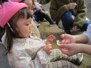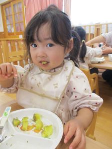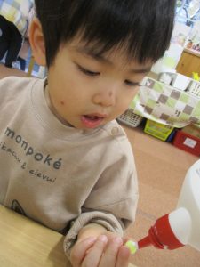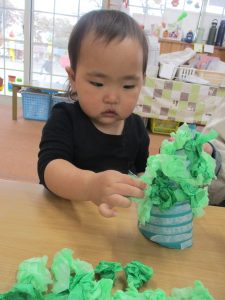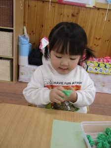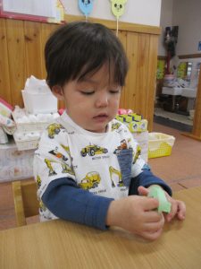 小さく丸めるのが少し難しい様子もみられましたが、「ギュッギュッするよ」「お豆くらいに小さくできるかな??」と声を掛けると、先生の真似をして一生懸命丸める姿がみられました✨