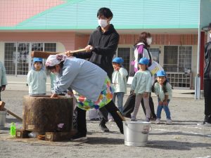 年長組のお友だちがもちつきをしたので、みんなで見学に行きました!!!