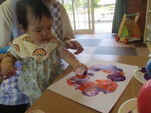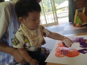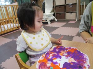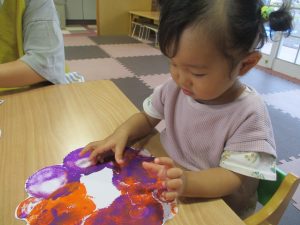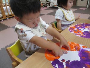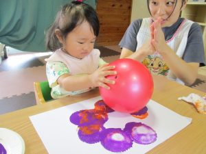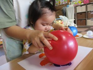 模様付けでは、大きさや色の違ったボールを用意し、画用紙にぺたぺたと可愛くデコレーションしました。
