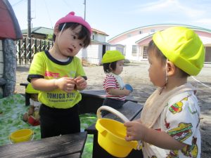 バケツに砂を入れてみたり、保育者が拾ってきた自然物を使って遊びを楽しむことも増えてきました。