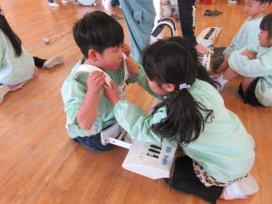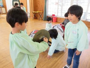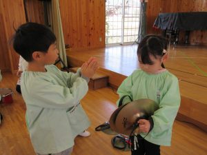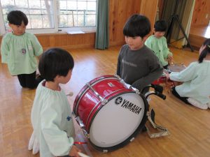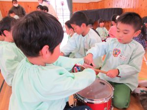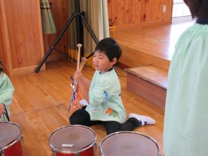 その後はさくら組のお友達に教わりながら全楽器を体験しました♪バチやガードの持ち方を教わったり、叩いてみたりとドキドキわくわくしながら取り組んでいました!