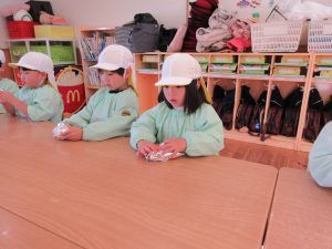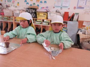 蒸かしたさつまいもをアルミホイルで2回包む活動では「アツアツだ~」「おなかがすいちゃうよ~」