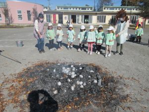 焚火に向かって優しく包んだおいもを入れ、「おいしくな~れ」とすてきな魔法をかけると・・・