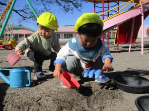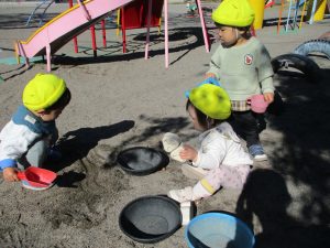 シャベルやバケツを自分達で使いこなし、集中して遊ぶ姿が見られるようになってきました。