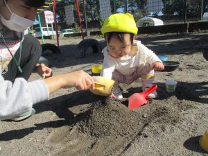 「トントントン」と、先生が作っている砂山を作るお手伝い💛