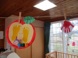 今月はみんなの手足型を使って、りんごの製作を行いました!!