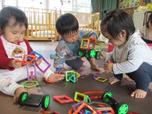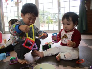 ブロック同士がくっつくことに気が付き、夢中で遊ぶ子ども達。