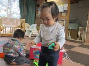 以前は、保育者が遊ぶ様子を見ていたり、真似をすることが多かった子ども達ですが、今では自分達で考えて遊びを広げていく姿が見られます♬