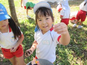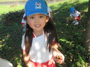 園庭にも落ちているのですが、富屋地区での文化祭の作品に使用するためにもっと必要になるね!ということで、駐車場に拾いに行きました!