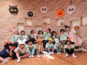 英語教室のハロウィンパーティーではお遊戯室を装飾してもらい、