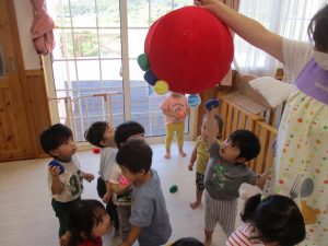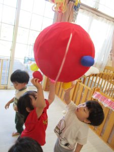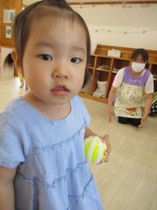 くっつきボールでは、マジックテープ素材の大きなボールに向かってボールを投げて遊びました!