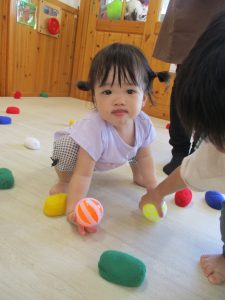 室内遊びでは、くっつきボールやトンネルなど、初めて遊ぶ玩具に大興奮のつぼみさんでした(*^^*)