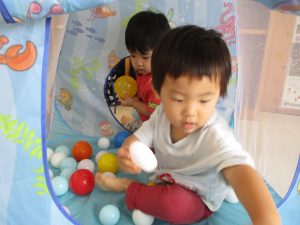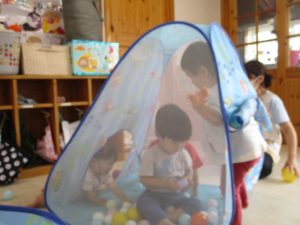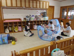 トンネルやテントで遊んだ際にも、子どもたちは大喜びで、保育室内には子どもたちの楽しそうな笑い声が響き渡っていました(^^♪