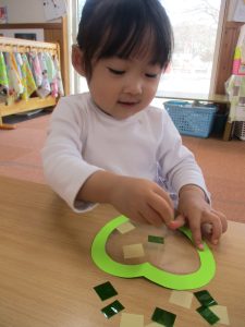 ペタペタしていて、手や洋服にくっついてきてしまい、「あれれれ??」と、不思議そうな表情を見せることもありましたが、保育者がそっと手を添えることでコツをつかむことができたようです♡