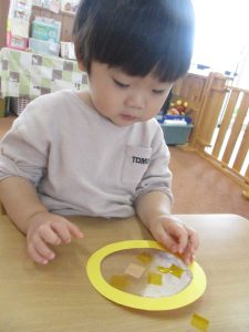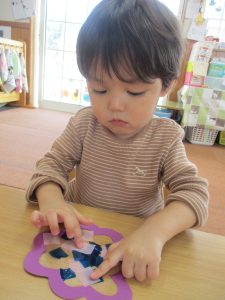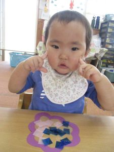 ペタペタしていて、手や洋服にくっついてきてしまい、「あれれれ??」と、不思議そうな表情を見せることもありましたが、保育者がそっと手を添えることでコツをつかむことができたようです♡