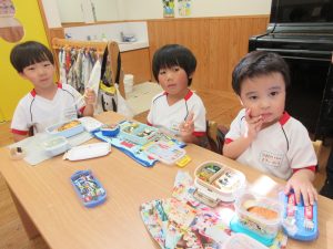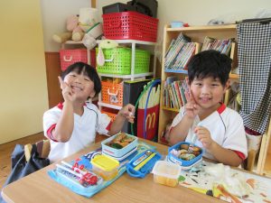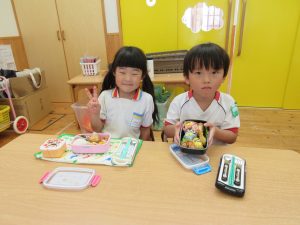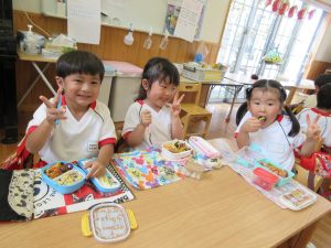 お弁当箱のふたを開け、嬉しそうに眺めたり笑顔いっぱいに食べたりする姿が見られていました🍙