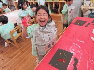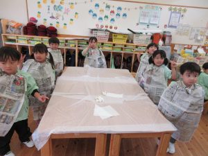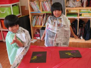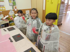 新聞紙の洋服もてるてる坊主のようで、かわいらしく似合っています❤
