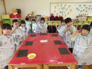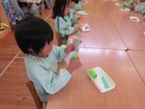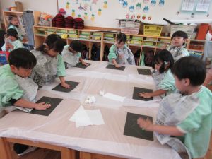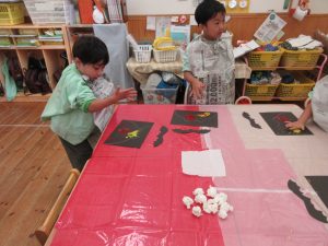緩衝材に絵の具をつけて模様をつけたりと、一人一人考えながら好きな素材を使って帽子を作っていました🖌