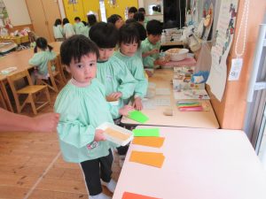 折り紙を巻く作業は、夏祭りのちょうちん作りで行ったため、「簡単だよ!」と自信満々な子ども達✨