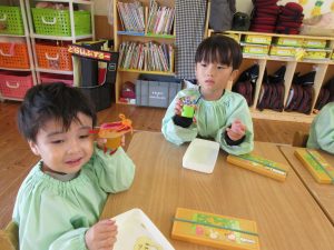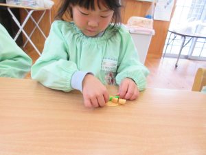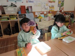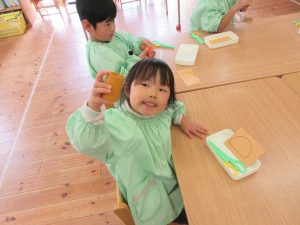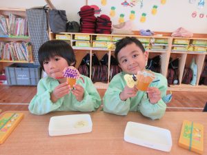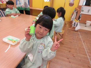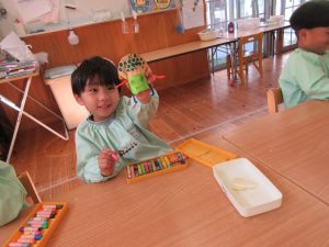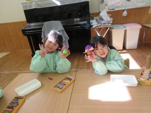 トイレットペーパーの芯に好きな色の折り紙を巻き、帽子をつけてドングリ作りを行いました!