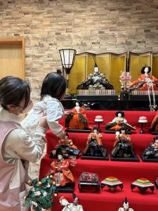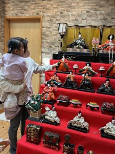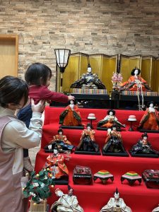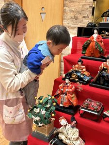 お内裏様・お雛様といった飾り物に興味津々の子どもたち。大きな雛壇飾りを見て、手を伸ばして触りたいとアピールする子も!!