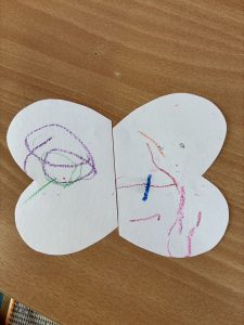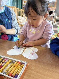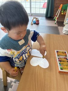 チョウチョの羽の形に切った白い画用紙にクレヨンで可愛いくデコレーションをし、最後は絵の具と筆を使い、はじき絵の技法で色付けを楽しみました。
