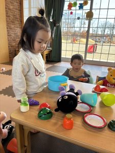 他にも、大きい鍋に好きな食べ物を入れて「まぜまぜ~」とかき混ぜる様子や、椅子に座って食べたりと自由に遊びを楽しんでいました♡