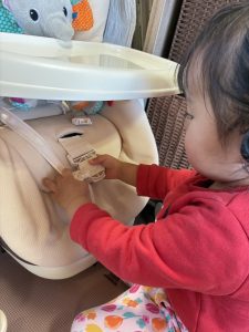 ラックに座らせると、ベルトを着けようと必死に頑張るお友だち!