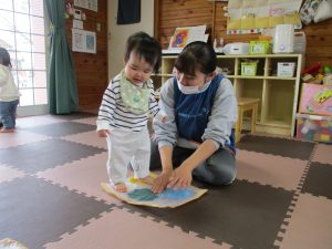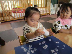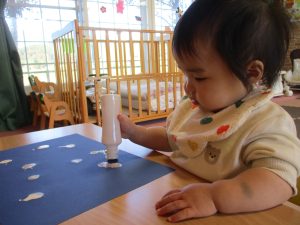 いざ、自分の番が来るとギューと強くスタンプを押したり、優しくスタンプをしたりと、力加減を変えながら楽しく作業することができました✨また自分が作った作品を見て、大きい雪や、小さい雪など色々な形の雪があることに気付き、「あっ!」と声に出して発見したことを沢山教えてくれました♡