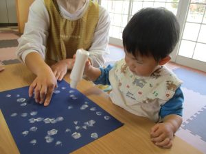 いざ、自分の番が来るとギューと強くスタンプを押したり、優しくスタンプをしたりと、力加減を変えながら楽しく作業することができました✨また自分が作った作品を見て、大きい雪や、小さい雪など色々な形の雪があることに気付き、「あっ!」と声に出して発見したことを沢山教えてくれました♡
