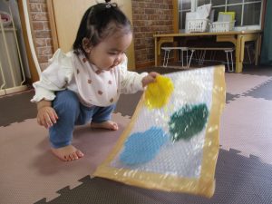 絵の具とプチプチシートを使って、感触遊びをしました。
