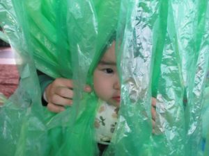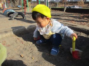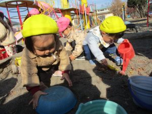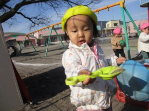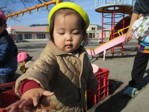 「今日はお外に出て遊ぼうね!」と声を話しをすると、外を指差したり、嬉しくて椅子から立ち上がって外に出ようとする子どもたち。戸外遊びが大好きなふたば組さんです!!