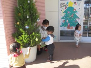 飾り付け終わった後は、保育室の近くにあるツリーを見て、クリスマスの雰囲気を楽しみました(^_-)-☆