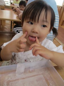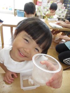 カップの中でカラカラと揺らして音を楽しむ子、溶けた水をパシャパシャ触って気持ちよさそうに遊ぶ子、氷をとにかくずっと握っている子など、みんな違った楽しみ方で思い思いに遊ぶ姿が見られました☆彡